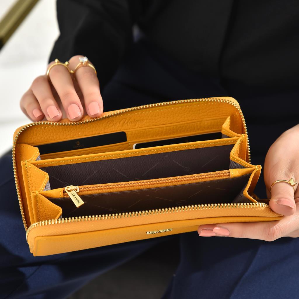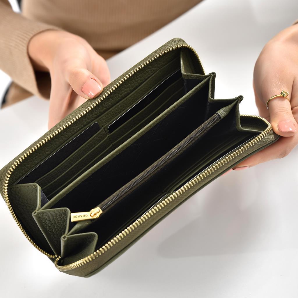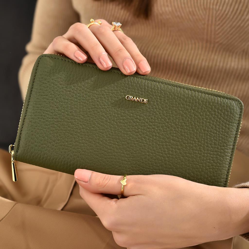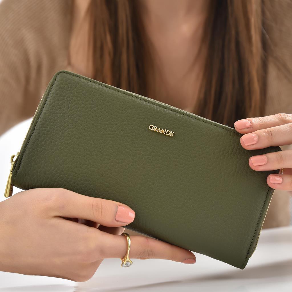 Grande Gerçek Deri Fermuarlı Kadın Cüzdanı Büyük Boy Hakiki Deri Petrol