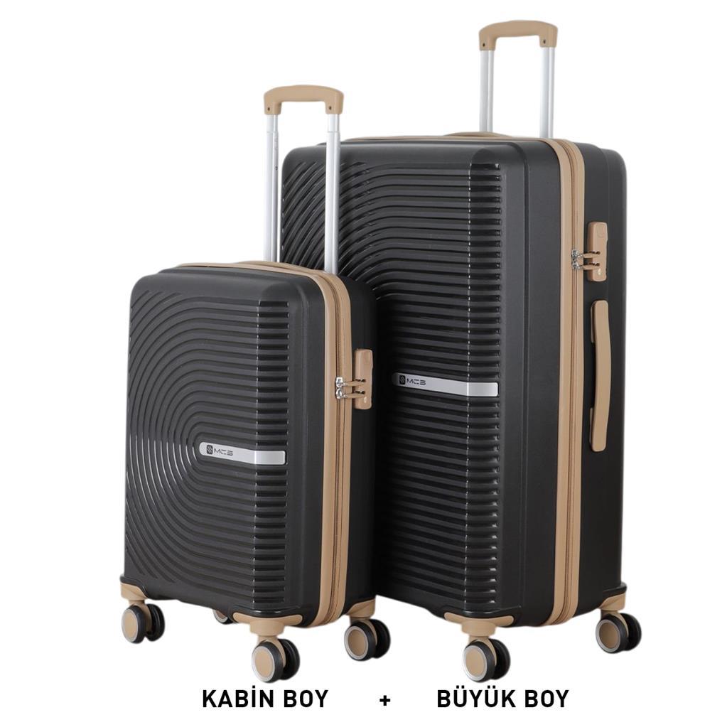 MÇS Bavul Büyük ve Kabin 2li Set Kırılmaz Silikon Valiz V374 Siyah/Şampanya