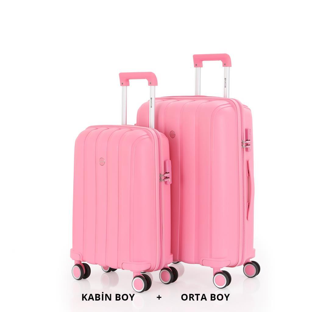 MÇS Bavul Orta ve Kabin 2li Set Kırılmaz Silikon Valiz V305 Pembe
